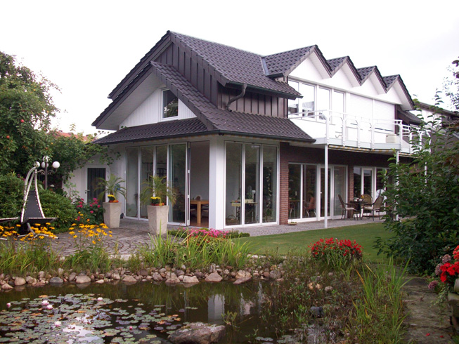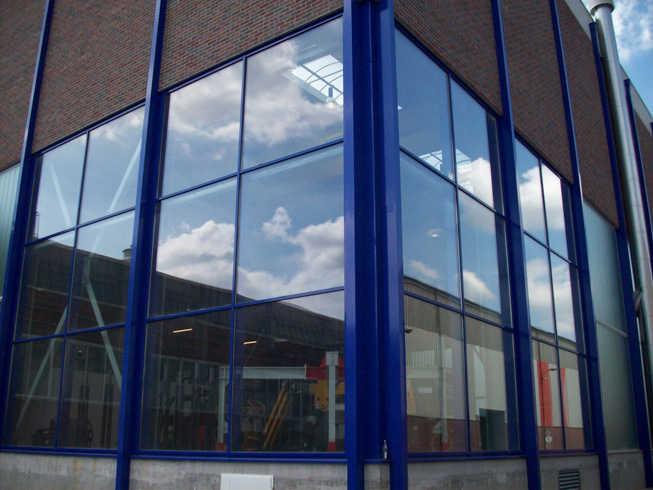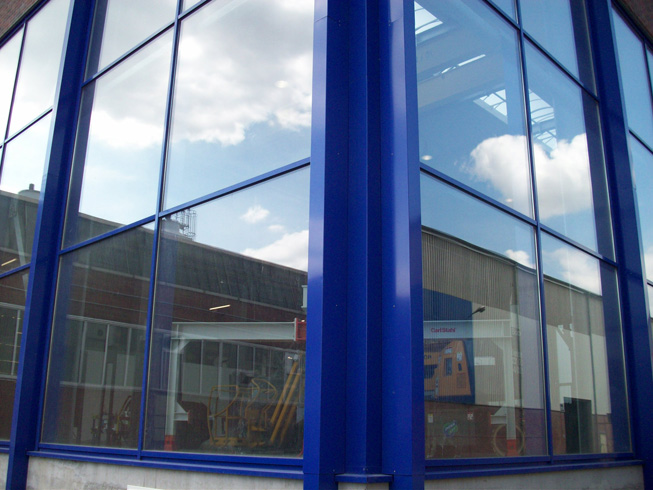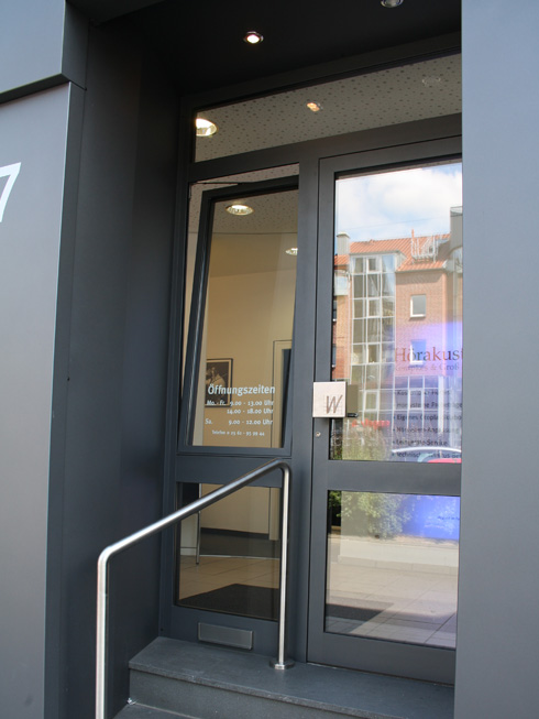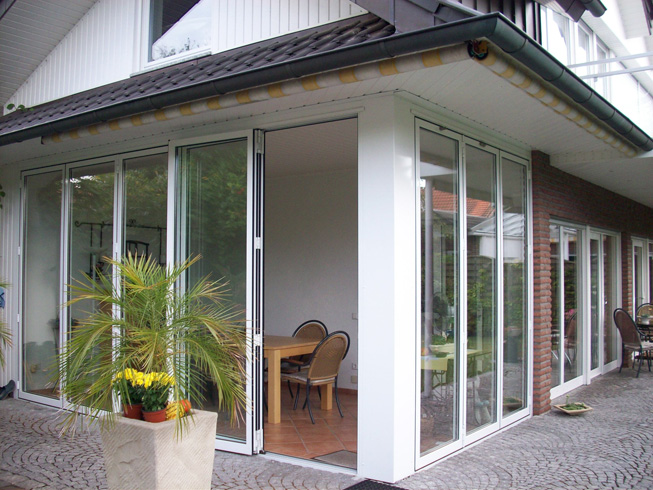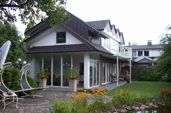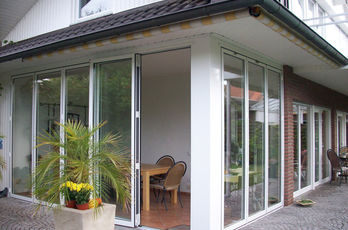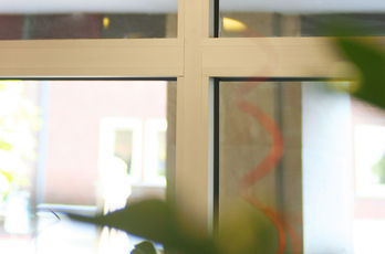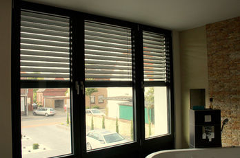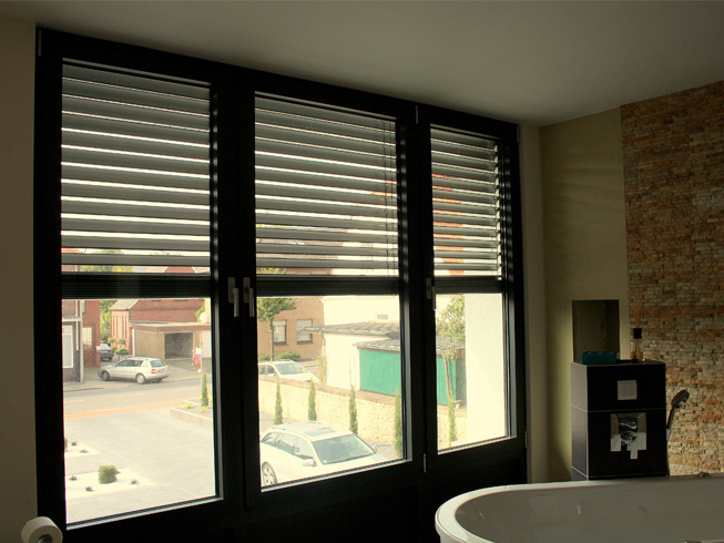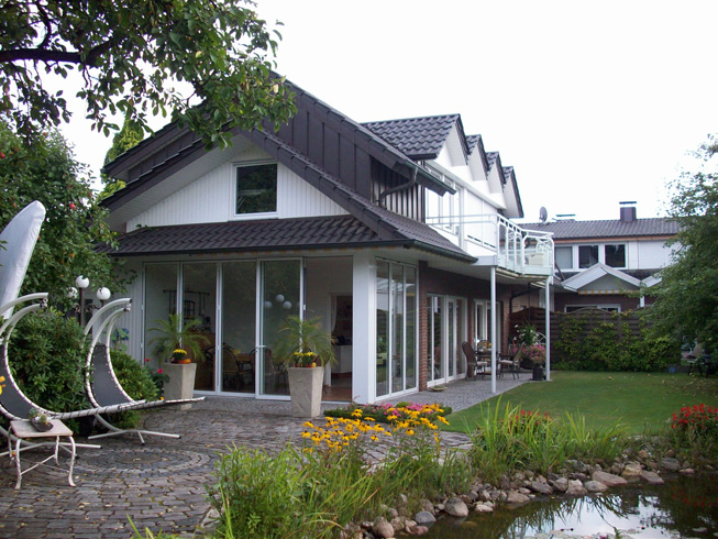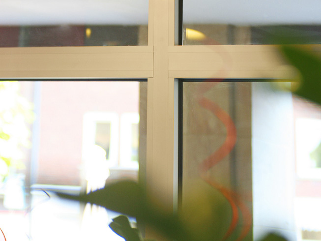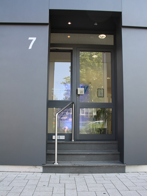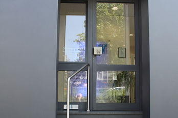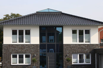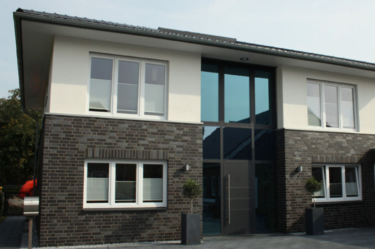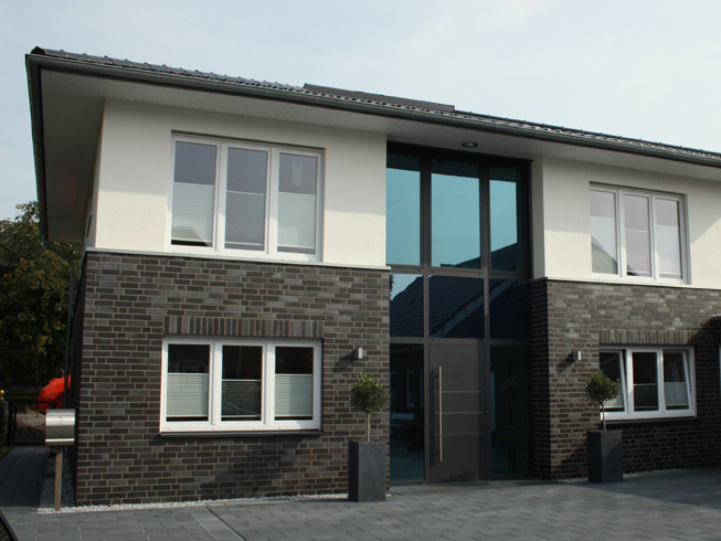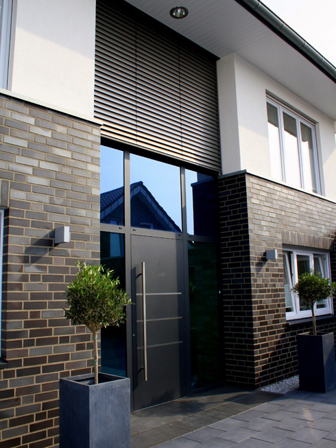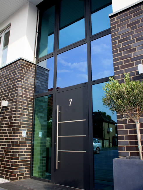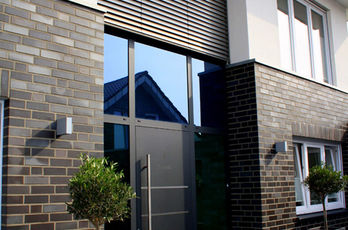 Die große Fassade verleiht diesem Wohnhaus moderne Exklusivität. Das verspiegelte Sonnenschutzglas verhindert zum Einen die Wärmeentwicklung im Haus und macht zum Anderen die dahinterliegenden Wohnräume uneinsehbar. Die integrierte Haustür sowie die dazu passenden Außen-Raffstore aus Aluminium im oberen Teil der Fassade ergeben ein komplettes und stilvolles Bild.