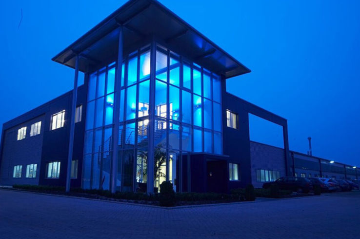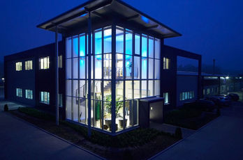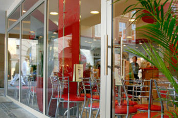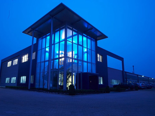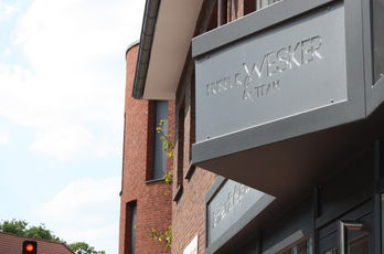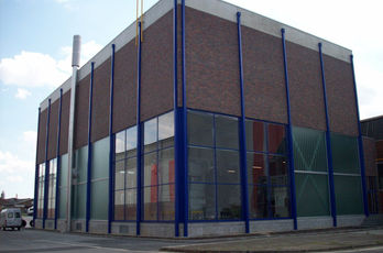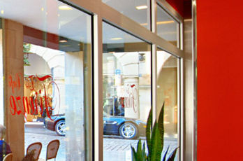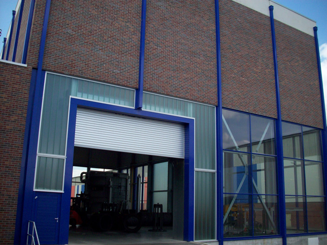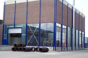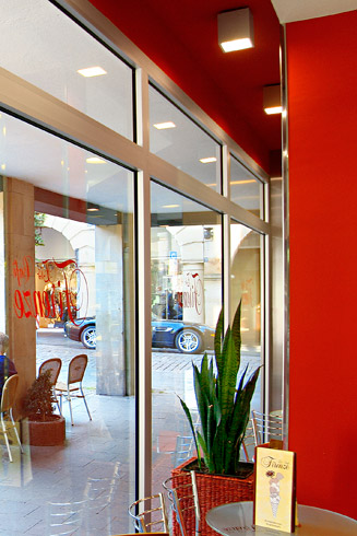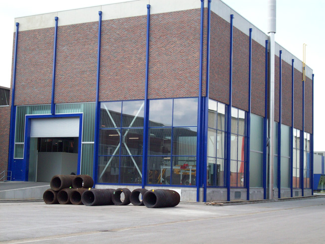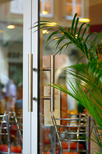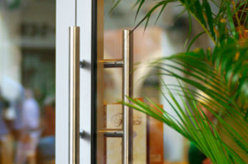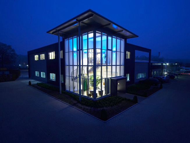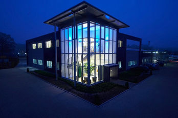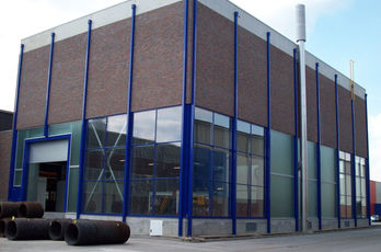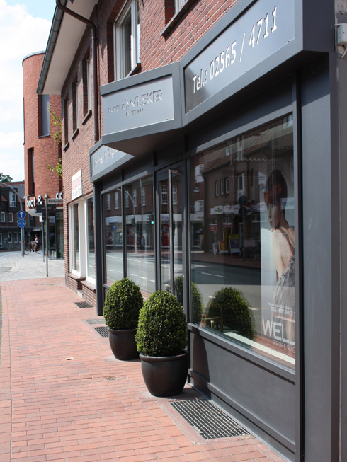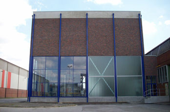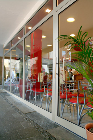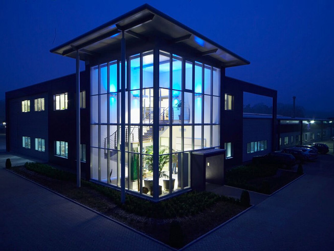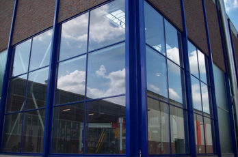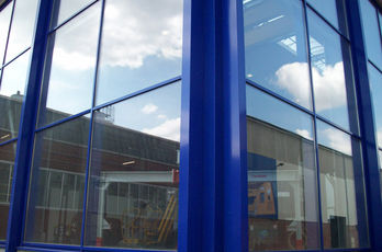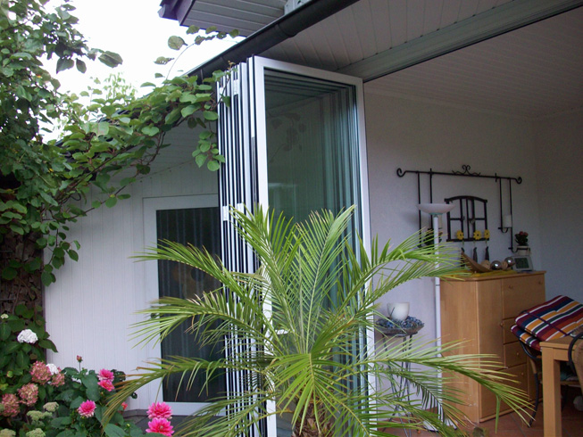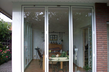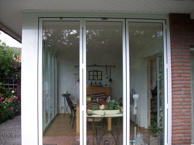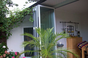 Die große Fassade verleiht diesem Wohnhaus moderne Exklusivität. Das verspiegelte Sonnenschutzglas verhindert zum Einen die Wärmeentwicklung im Haus und macht zum Anderen die dahinterliegenden Wohnräume uneinsehbar. Die integrierte Haustür sowie die dazu passenden Außen-Raffstore aus Aluminium im oberen Teil der Fassade ergeben ein komplettes und stilvolles Bild.